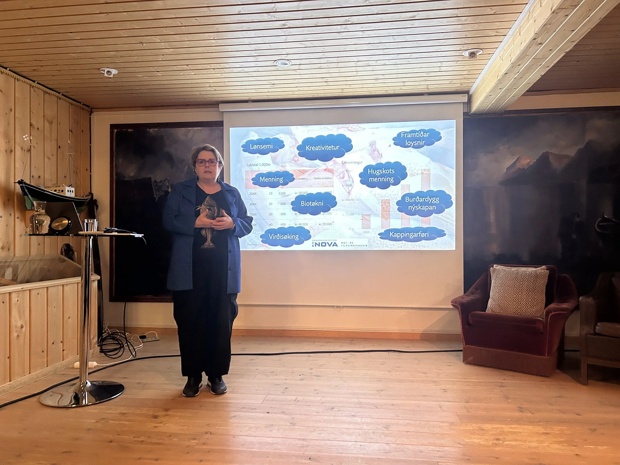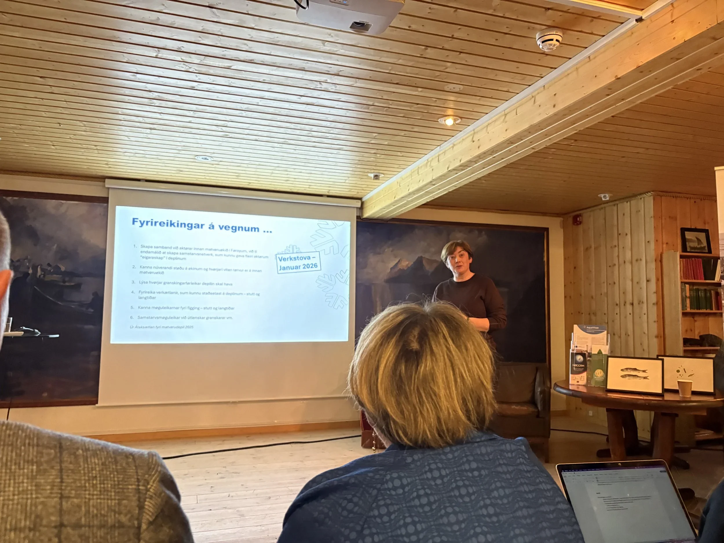 Unn Laksá, Director of Sjókovin, welcomed the audience. Then Drós í Ólavsstovu, an adviser at the new Food and Resource Centre — established under the Ministry of Foreign Affairs, Industry and Trade — spoke about the centre’s plans and prospects, and how she envisions it supporting companies in developing new products.